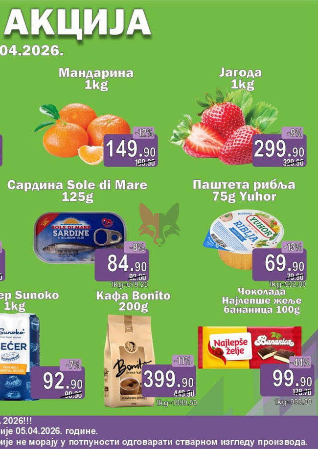 Svi katalozi i cene objavljeni na Lisica.RS Akcijskim katalozima su informativni tako da pre kupovine obavezno proverite ponudu na licu mesta. Pošto trgovci mogu bez najave da izvrše izmenu već objavljenih akcijskih kataloga, Lisica.RS Akcijski katalozi ne može biti odgovoran za važnost i tačnost istih. Lisica.RS Akcijski katalozi ne vrši prodaju proizvoda označenih na akcijskim katalozima.