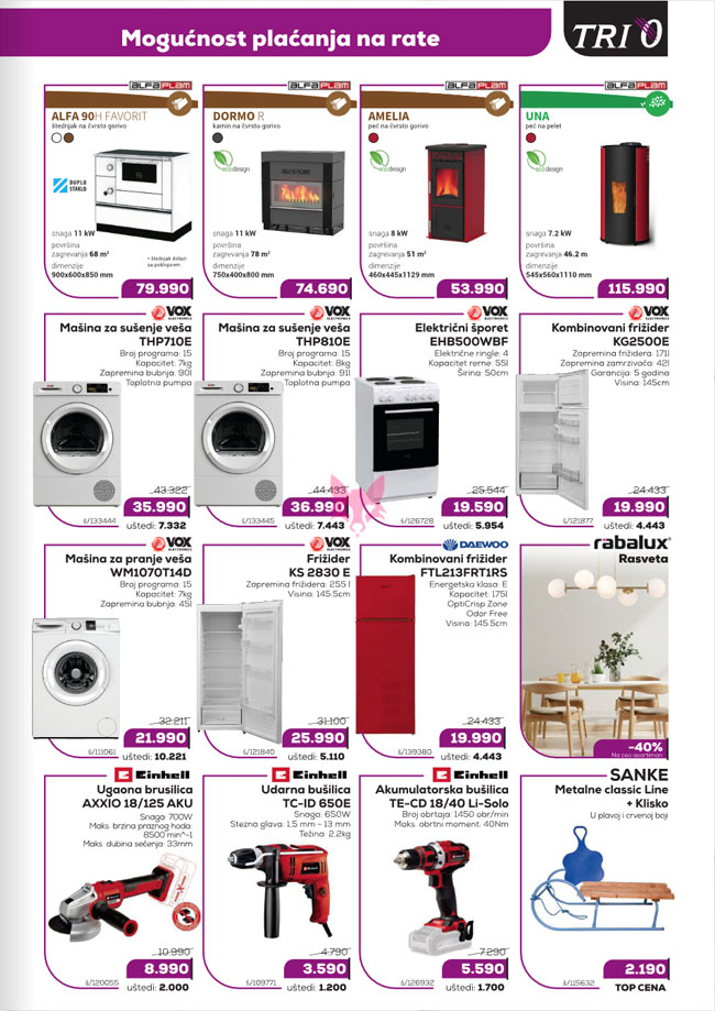 Alati i mašine, Audio, foto i video uređaji, Bela tehnika, Klima uređaji, Mali kućni aparati, Ostalo za kuću i stan, Rasveta, Sve za baštu i dvorište, Sve za grejanje, Sve za igru, Sve za zimu, Telefoni