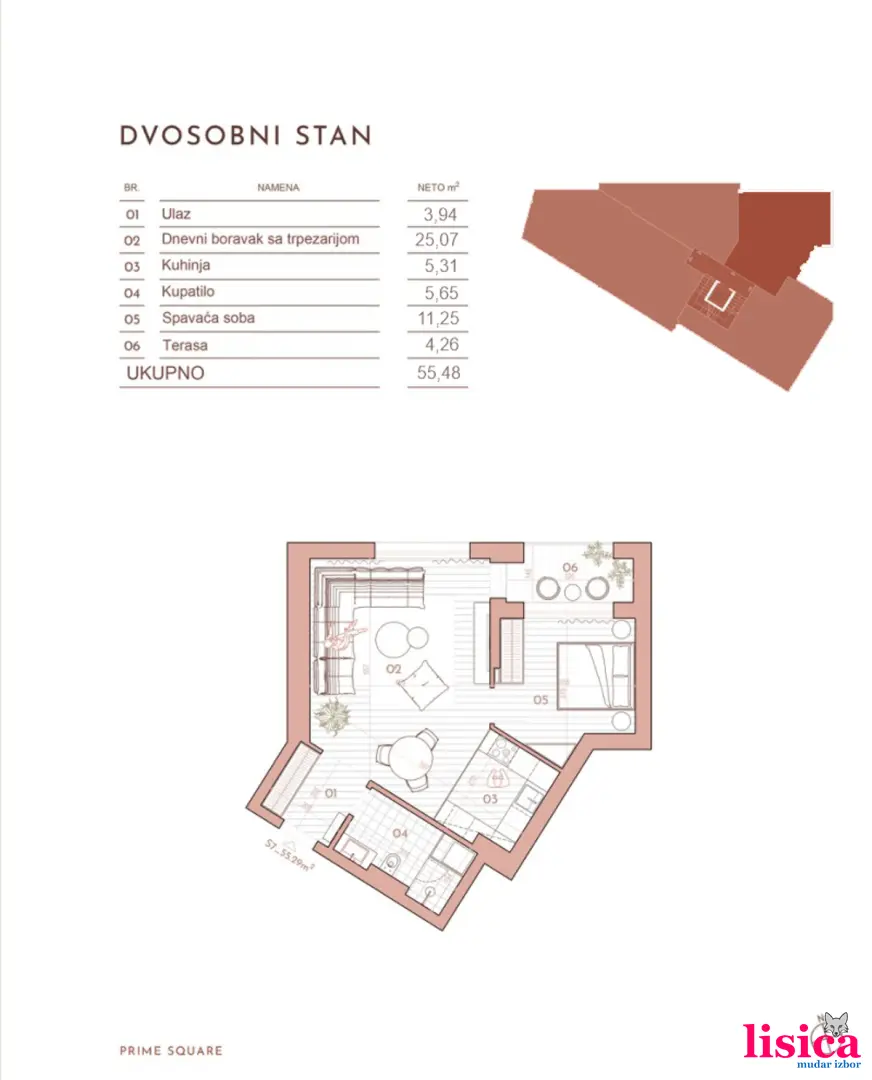 U okviru Prime Square objekta u ponudi su dvosobni stanovi od 55,48m2 po ceni od 304.530 € (4.990€/m2+pdv) na II III i IV spratu