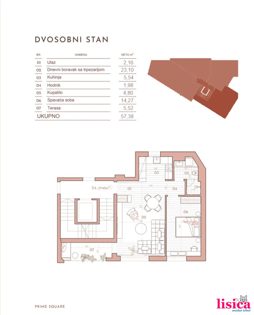 U okviru Prime Square objekta u ponudi su dvosobni stanovi od 57,38m2 po ceni od 314.959 € (4.990€/m2+pdv) na I IV i V spratu