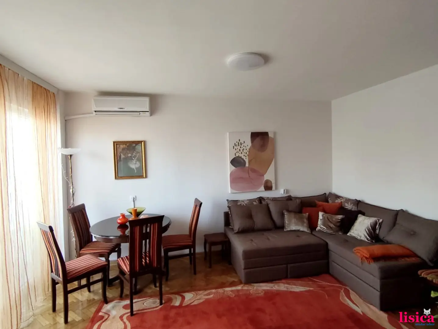 Dnevni boravak sa kuhinjom i trpezarijom, spavaća soba, hodnik, kupatilo, terasa i zastakljena lodja. Poseduje klimu, internet i dva televizora.