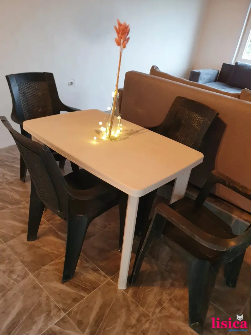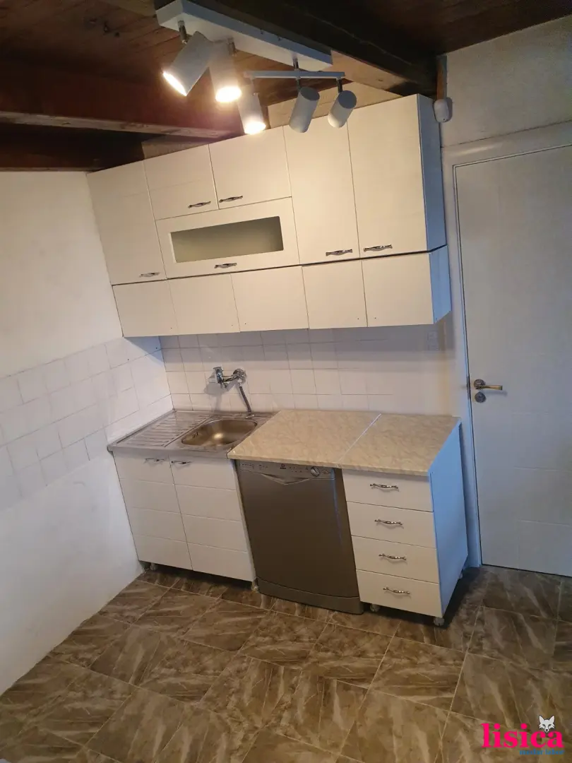 Kuća je povrsine 51m2,i kompletno je nameštena za udoban život (ima mašinu za sudove, za sušenje veša...). Ako je stanarima potrebno još nešto od nameštaja, vlasnik će to dokupiti. U prizemlju su dnevna soba, kuhinja i kupatilo, a u podkrovlju su 2 spavaće sobe. Ispred kuće je betonirana terasa od 25m2.