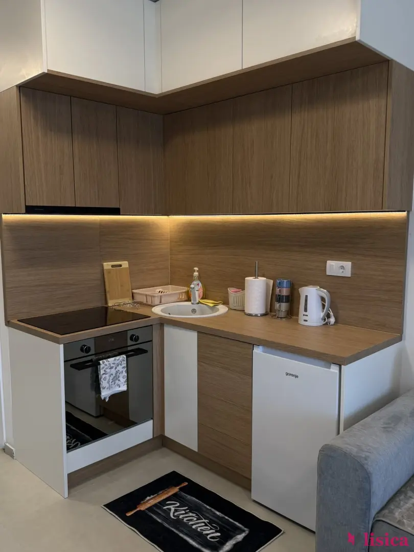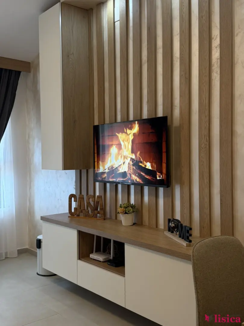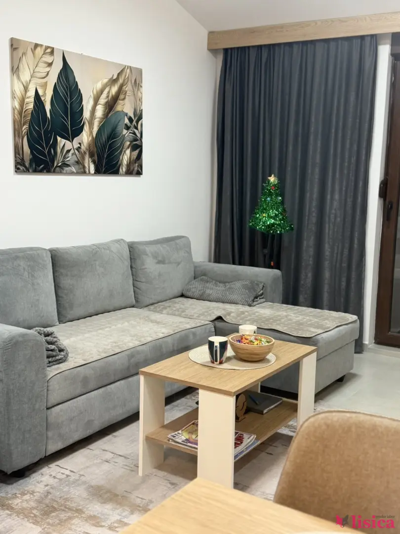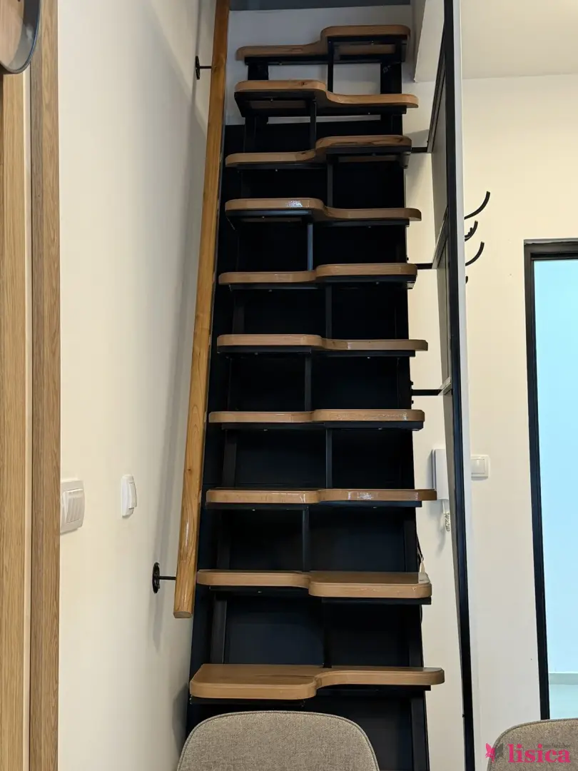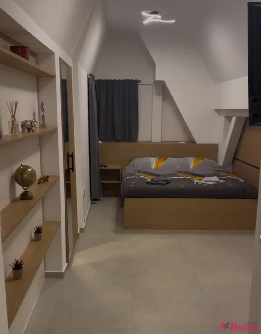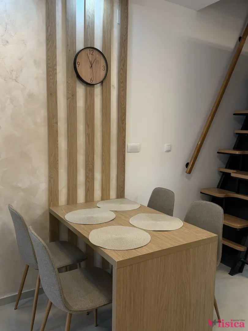 Apartman duplex se nalazi u zgradi na četvrtom spratu (zgrada nema lift). Zgrada je završena u decembru 2024. Apartman je kompletno opremljen sa nameštajem koji je pravljen po meri. Na donjem nivou apartmana nalazi se dnevni boravak sa ugaonom garniturom na razvlačenje, trpezarijski sto, kompletno opremljena kuhinja sa šporetom (četiri ringle i rerna), kupatilo, terasa. Na gornjem nivou je predsoblje, veliki deo za spavanje sa francuskim ležajem (sve kosine su zatvorene namenskim ormarima), kupatilo. Ima obezbeđeno parking mesto.