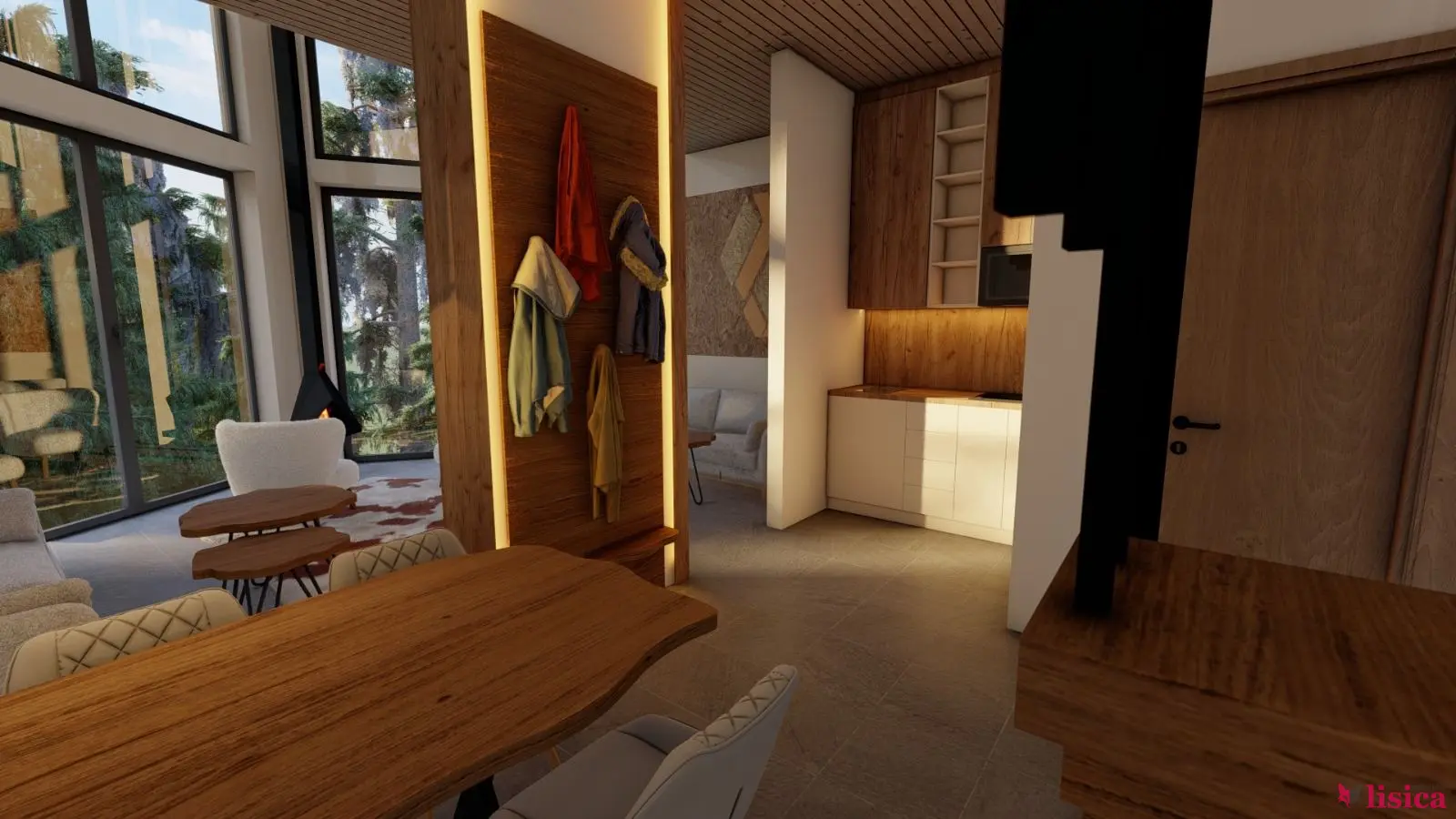 Kuća je povezana toplom vezom kao i apartman sa svim sadržajima recepcija, restoran, SPA i skijašnicom kompleksa Chalet.