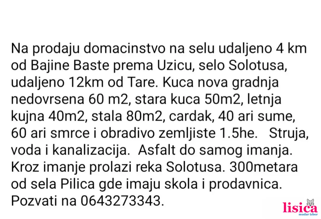 Prodaje se seosko domaćinstvo 4km od Bajine Bašte selo Solotuša. Plac 2.5 ha, 2 kuće, šuma, štala. . . .