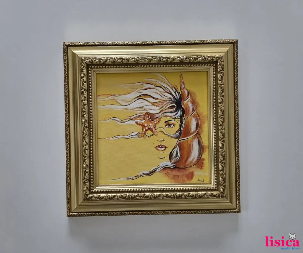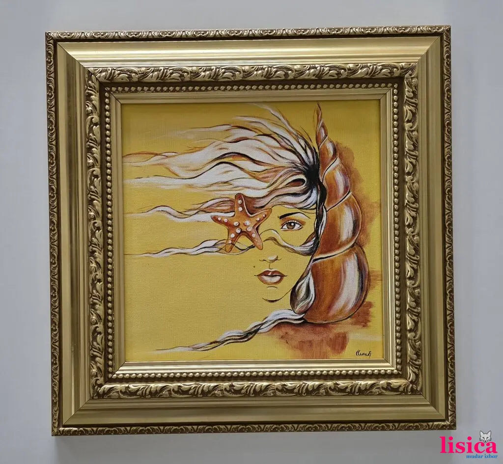 Slika Šapat školjke, tehnika akril na platnu. Prelepo umetničko delo. Slika je uramljena u jako lep ram, dimenzije slike sa ramom 47 x 47. Privatna kolekcija.