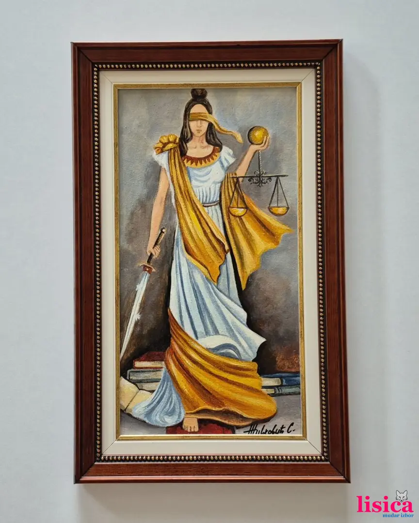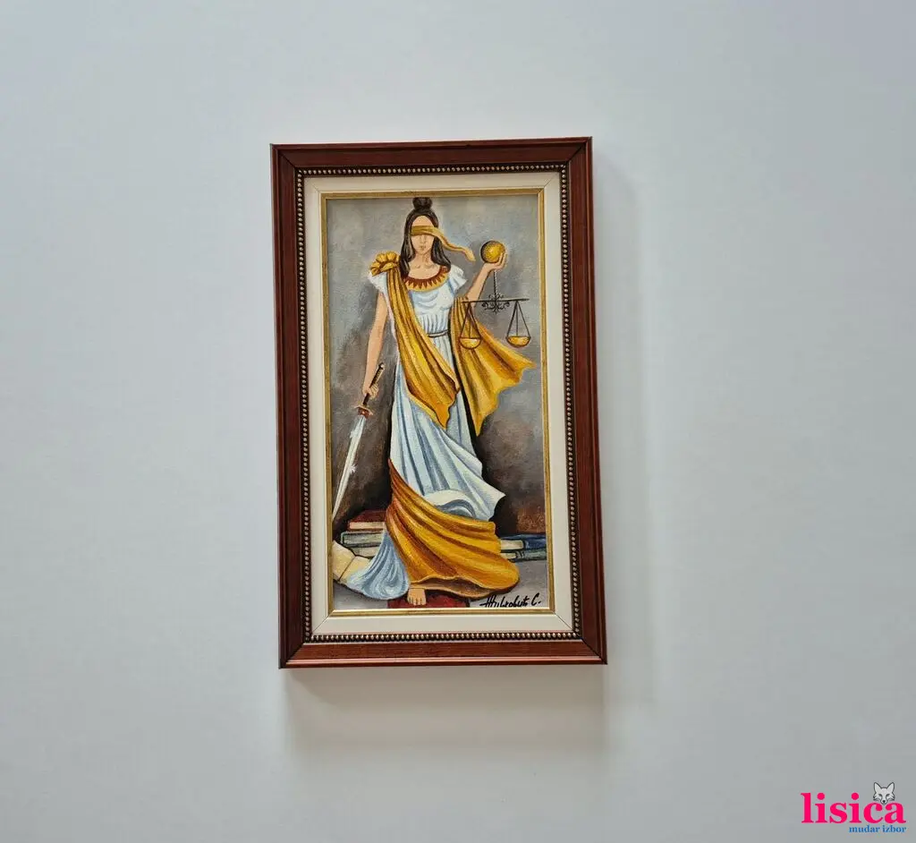 Ulje na platnu Boginja pravde, prelepo umetničko delo. Slika je uramljena u jako lep ram, dimenzije slike sa ramom 46 x 28. Privatna kolekcija.