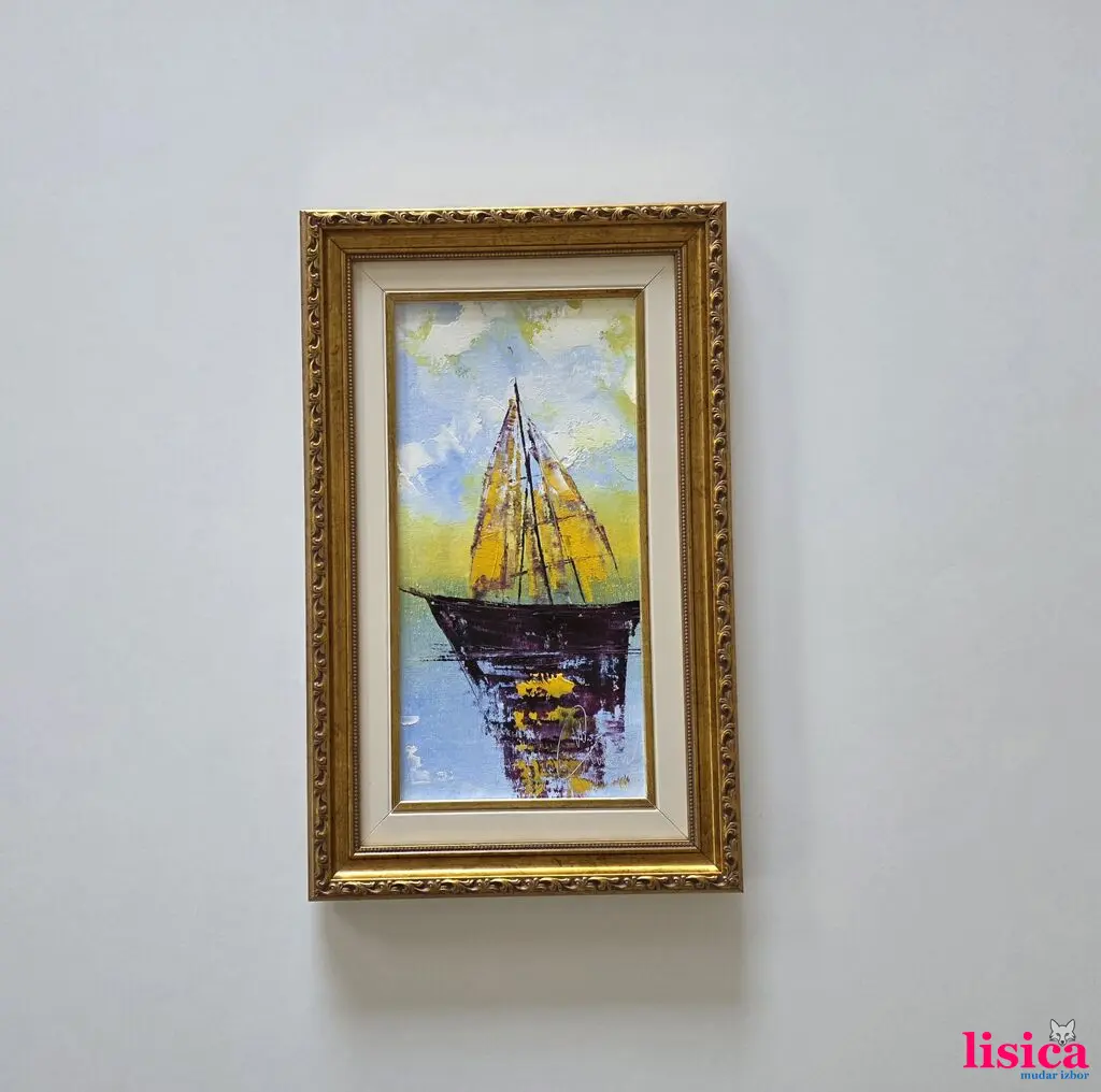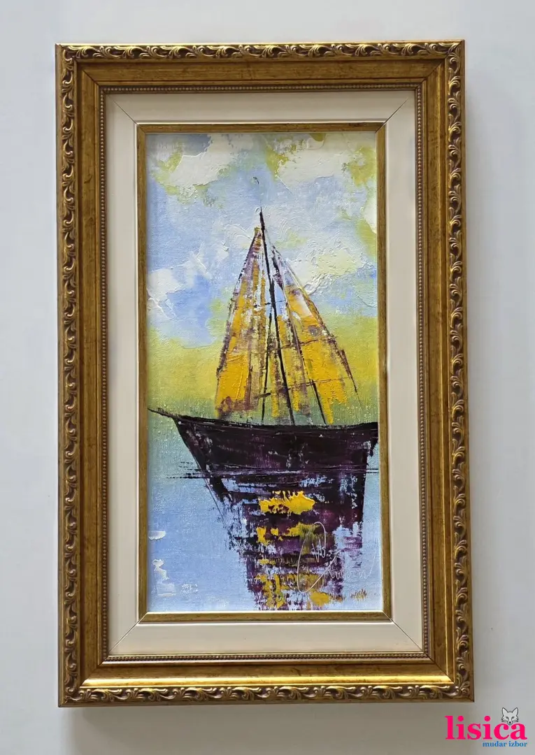 Ulje na platnu Brodić na moru, prelepo umetničko delo. Slika je uramljena u jako lep ram, dimenzije slike sa ramom 42 x 27. Privatna kolekcija.
