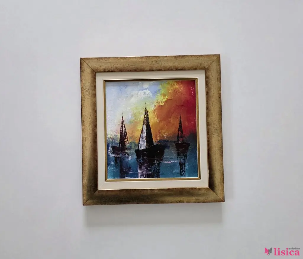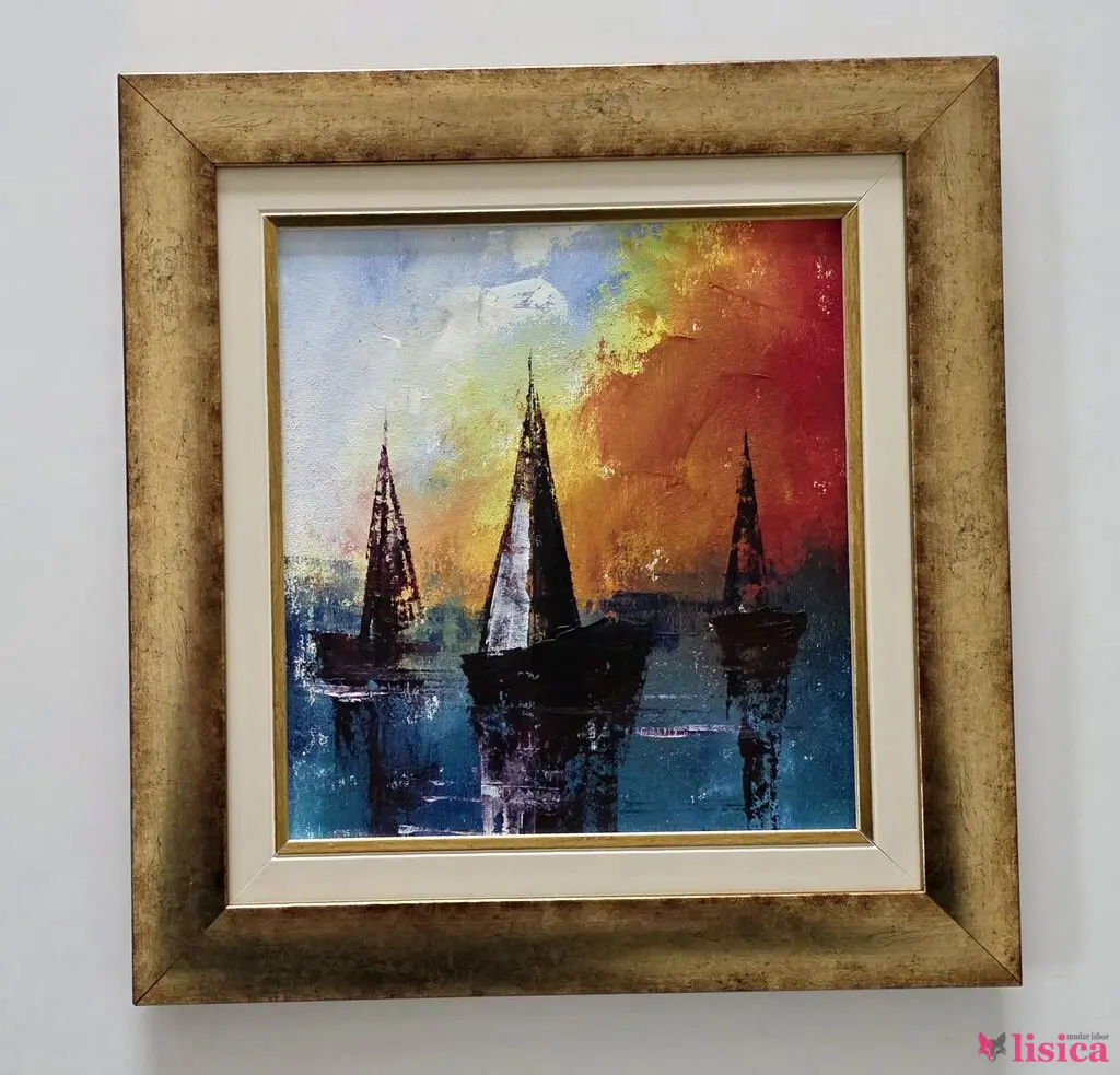 Ulje na platnu Crveno nebo, mirna luka. Prelepo umetničko delo. Slika je uramljena u jako lep ram, dimenzije slike sa ramom 39 x 37. Privatna kolekcija.