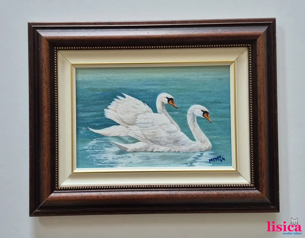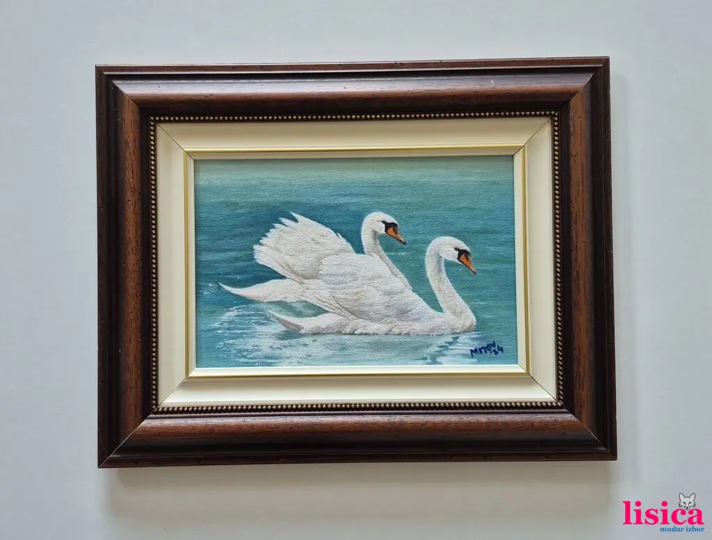 Ulje na platnu Dva bela labuda, prelepo umetničko delo. Slika je uramljena u jako lep ram, dimenzije slike sa ramom 47 x 37. Privatna kolekcija.