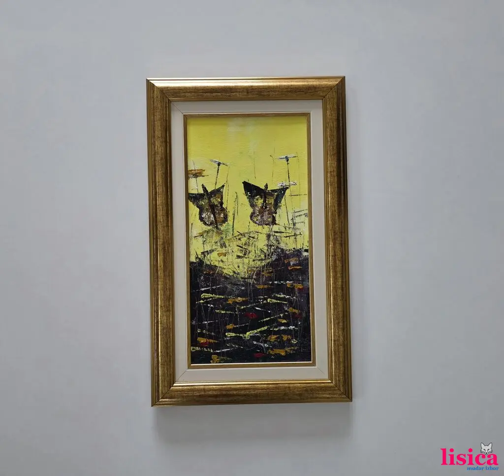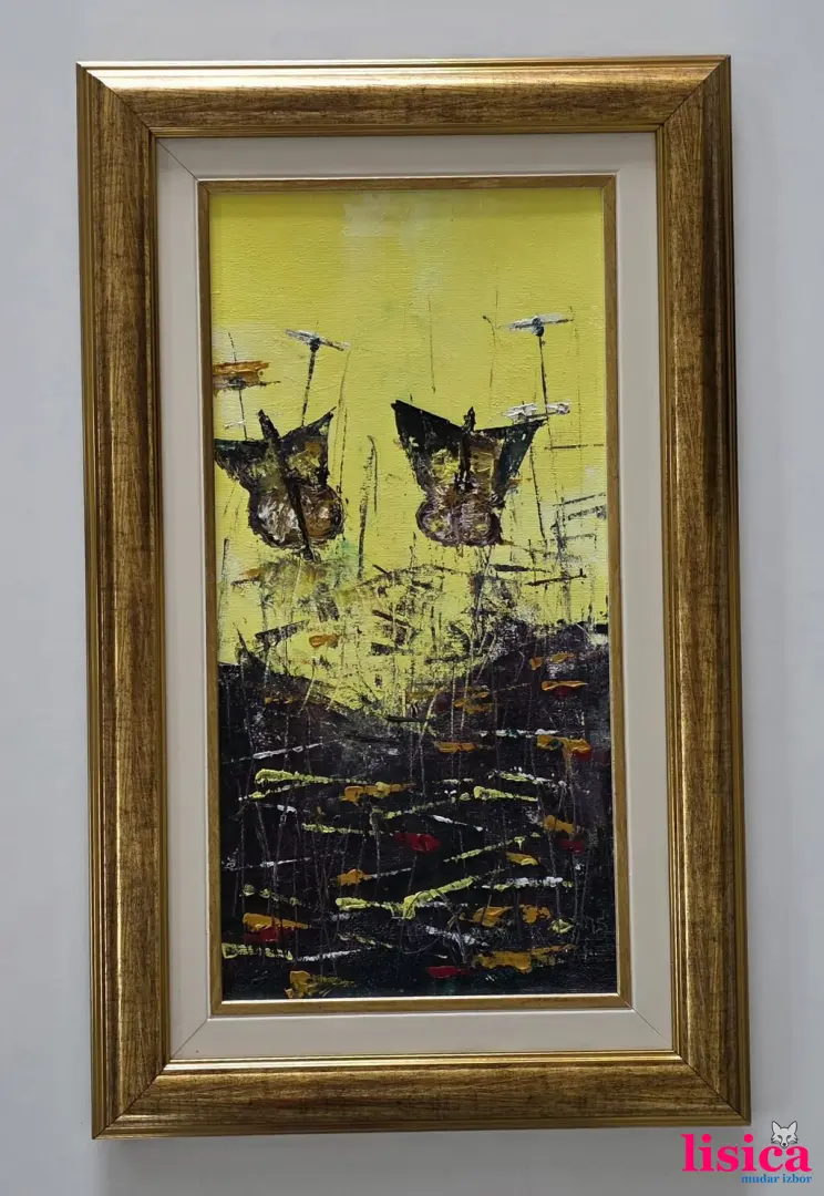 Ulje na platnu Dva leptira, prelepo umetničko delo. Slika je uramljena u jako lep ram, dimenzije slike sa ramom 52 x 32. Privatna kolekcija.