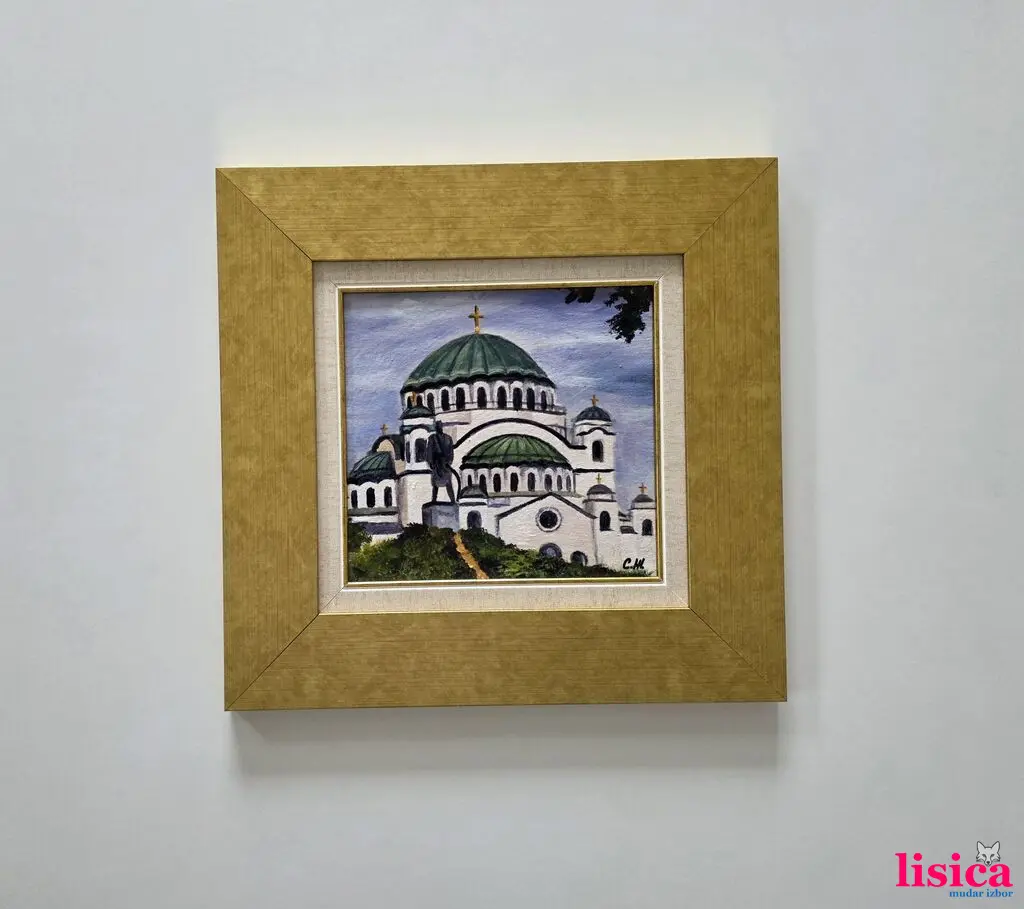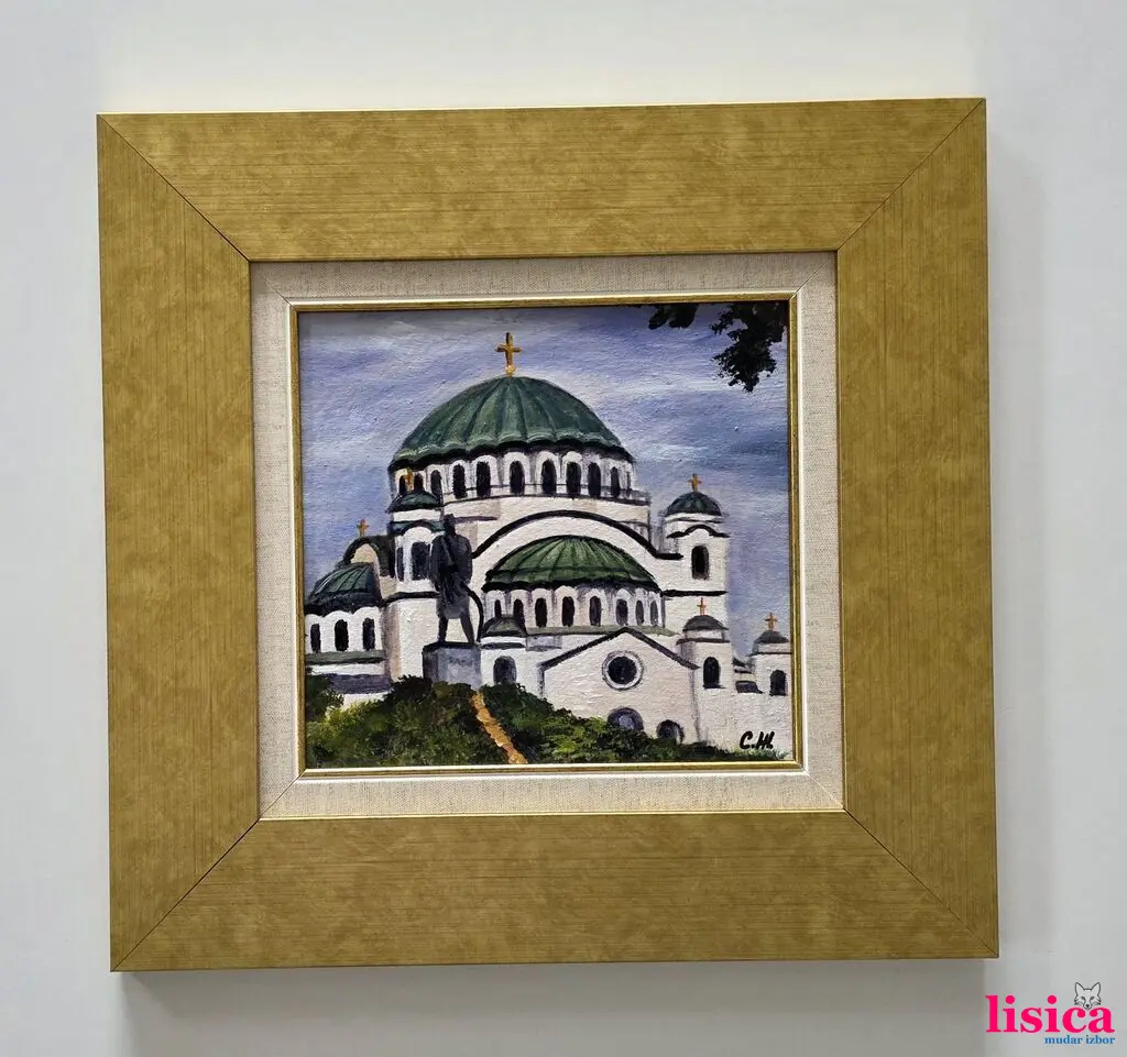 Ulje na platnu Hram Svetog Save, prelepo umetničko delo. Slika je uramljena u jako lep ram, dimenzije slike sa ramom 41 x 40. Privatna kolekcija.