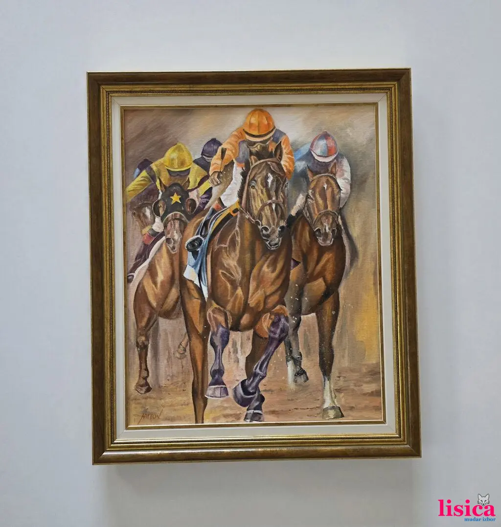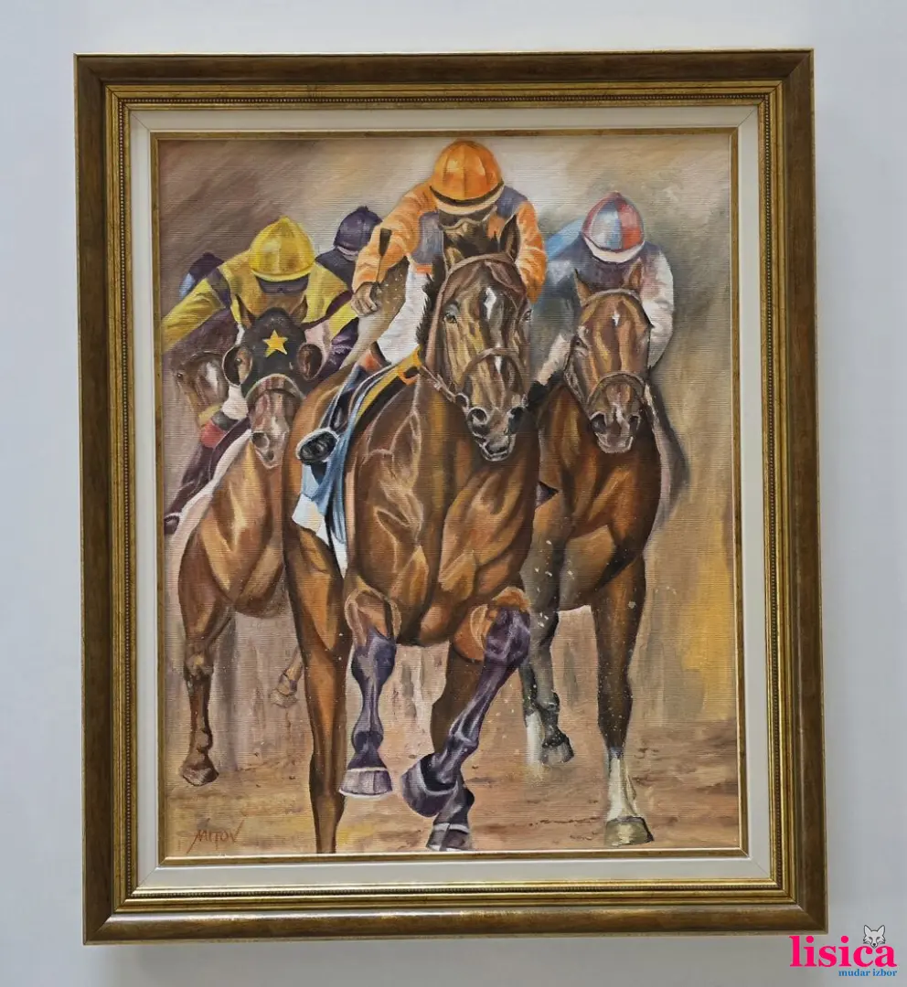 Ulje na platnu Konjska trka, prelepo umetničko delo. Slika je uramljena u jako lep ram, dimenzije slike sa ramom 60 x 50. Privatna kolekcija.