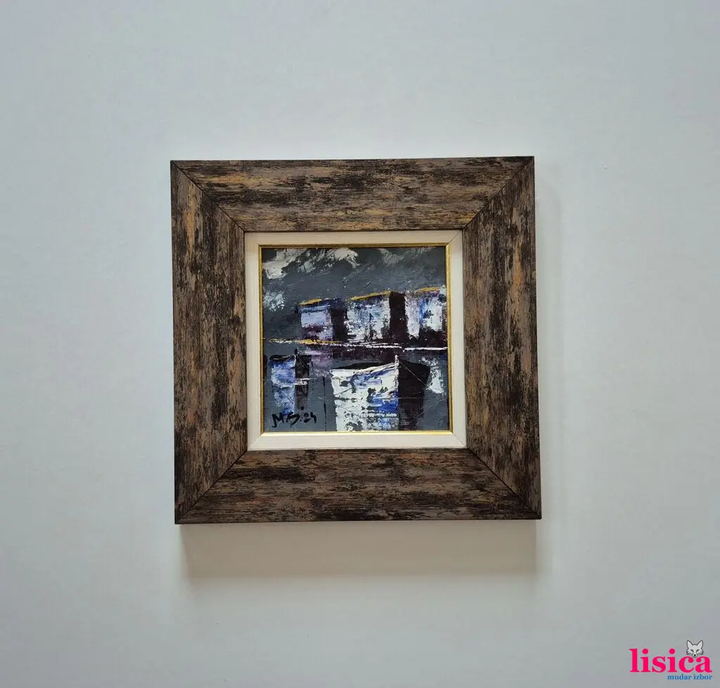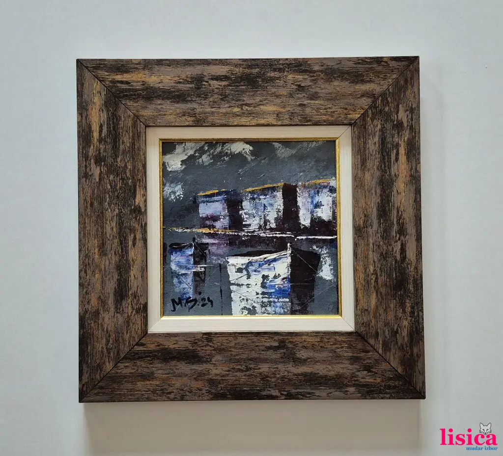Ulje na platnu Mala noć na moru, prelepo umetničko delo. Slika je uramljena u jako lep ram, dimenzije slike sa ramom 35 x 35. Privatna kolekcija.