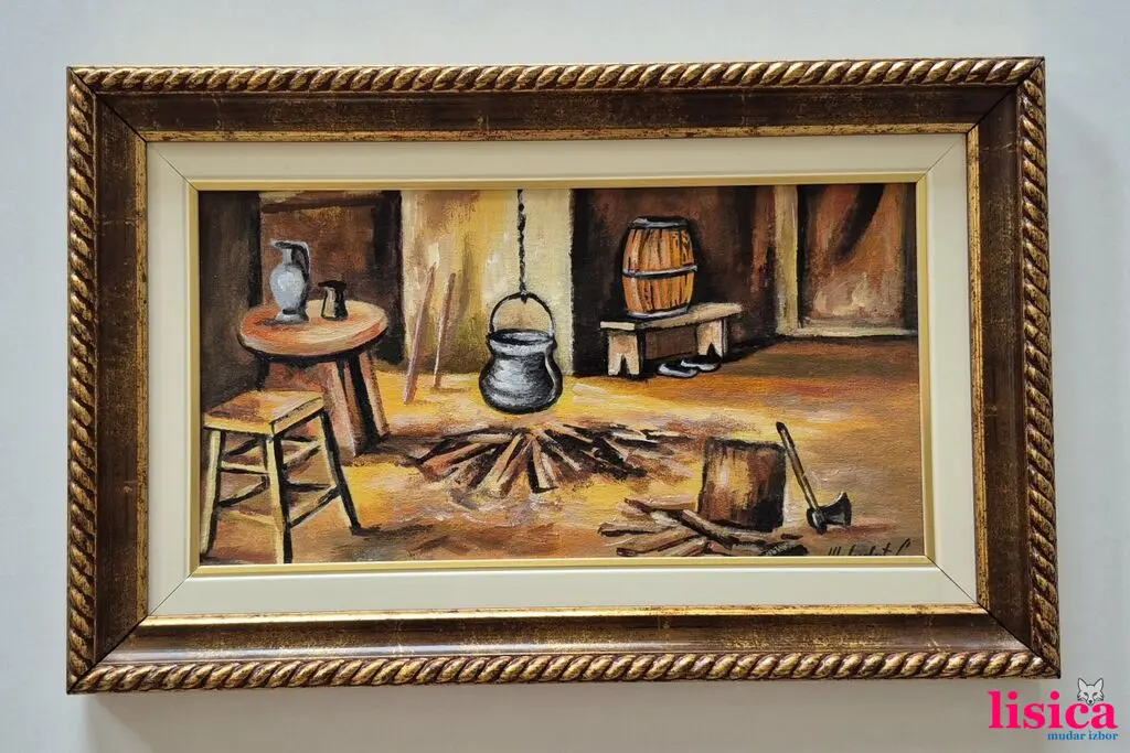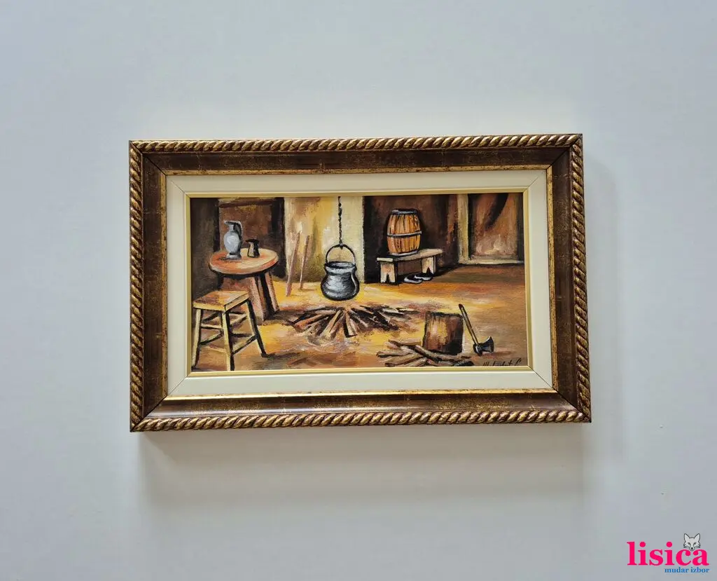 Ulje na platnu Ognjište, prelepo umetničko delo. Slika je uramljena u jako lep ram, dimenzije slike sa ramom 49 x 31. Privatna kolekcija.