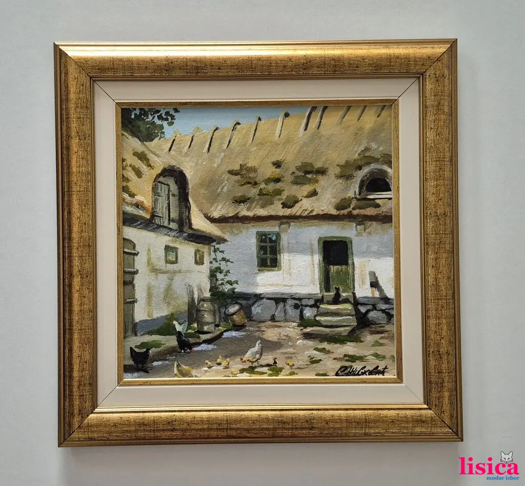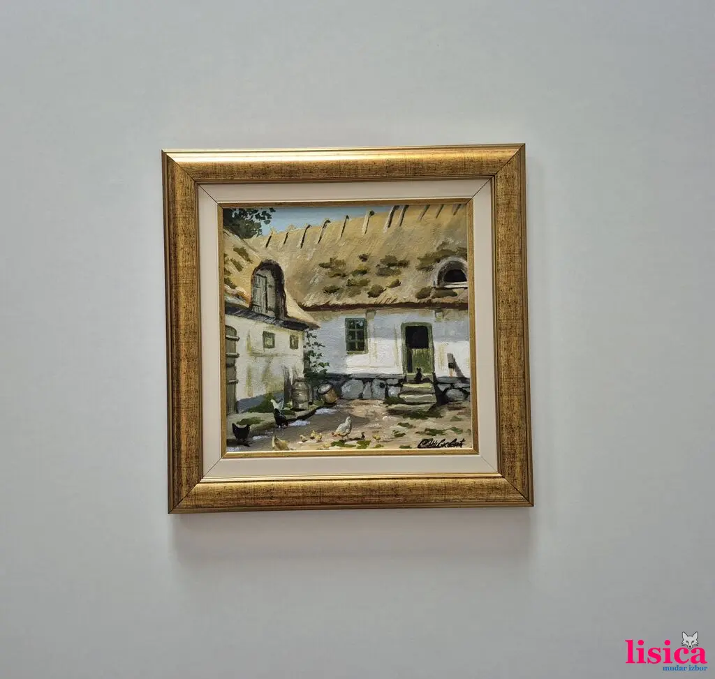 Ulje na platnu Seosko dvorište, prelepo umetničko delo. Slika je uramljena u jako lep ram, dimenzije slike sa ramom 40 x 40. Privatna kolekcija.