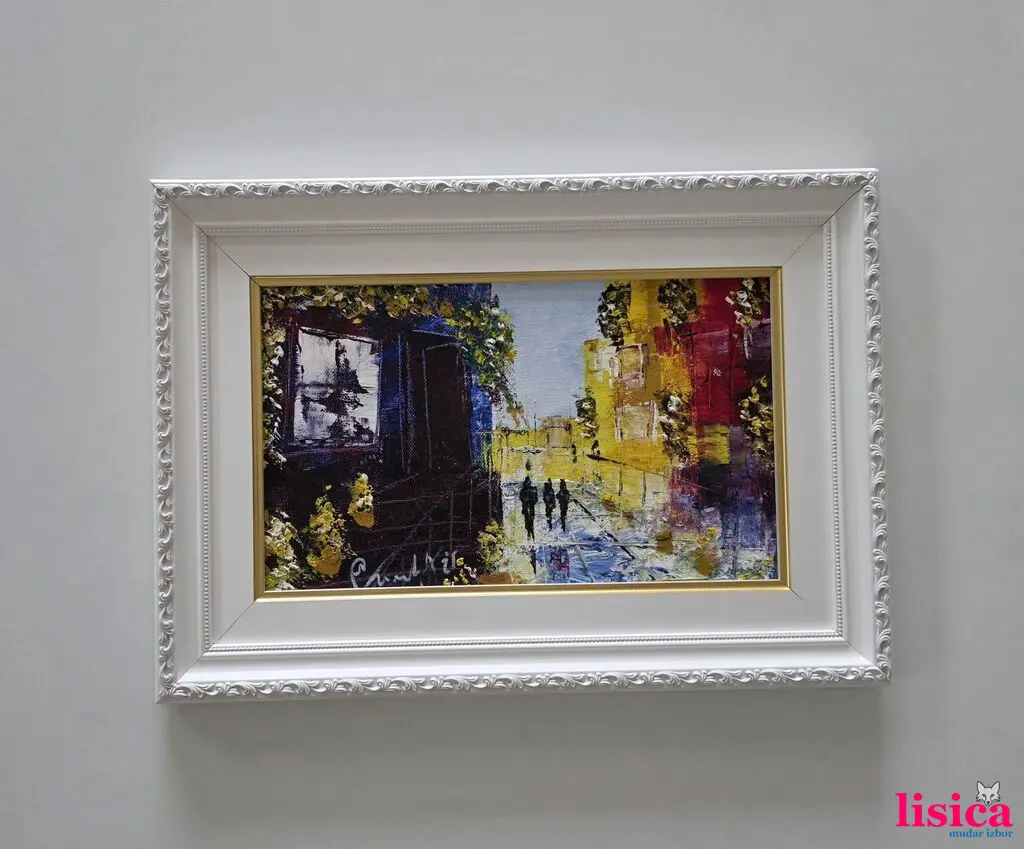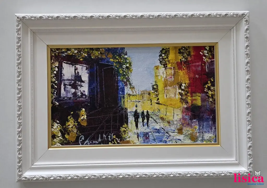 Ulje na platnu Šetnja kroz pasaž, prelepo umetničko delo. Slika je uramljena u jako lep ram, dimenzije slike sa ramom 42 x 30. Privatna kolekcija.