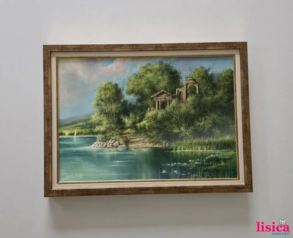 Ulje na platnu Stari grad uz reku, prelepo umetničko delo. Slika je uramljena u jako lep ram, dimenzije slike sa ramom 57 x 42. Privatna kolekcija.
