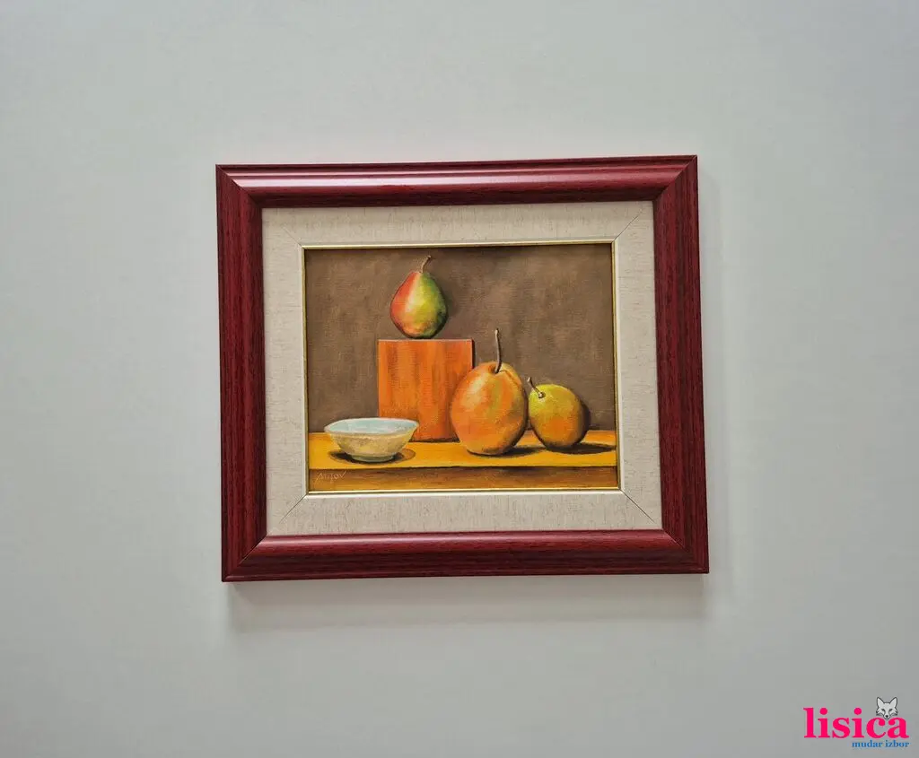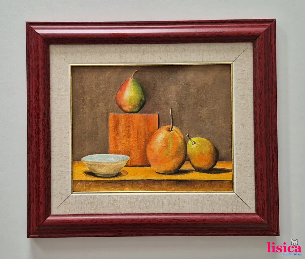 Ulje na platnu Voće i tanjir. Prelepo umetničko delo. Slika je uramljena u jako lep ram, dimenzije slike sa ramom 46 x 40. Privatna kolekcija.