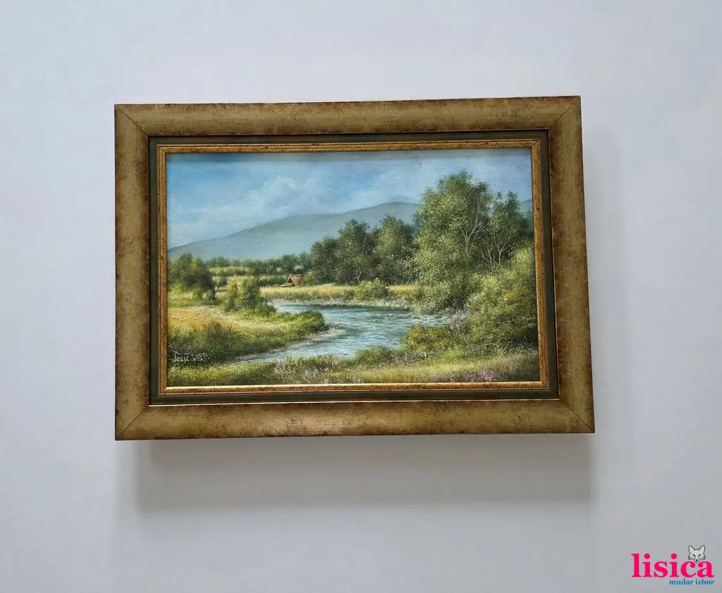 Ulje na platnu Žubor reke, prelepo umetničko delo. Slika je uramljena u jako lep ram, dimenzije slike sa ramom 56 x 40. Privatna kolekcija.